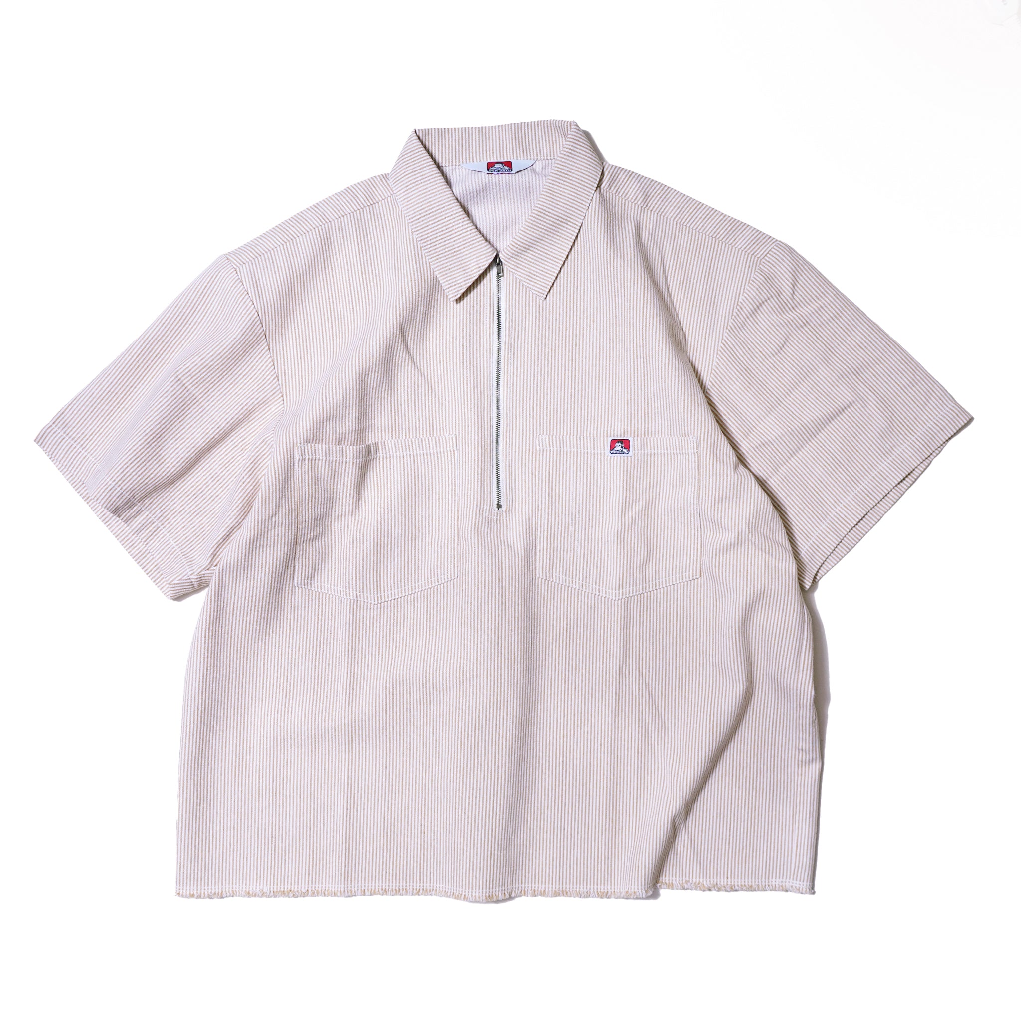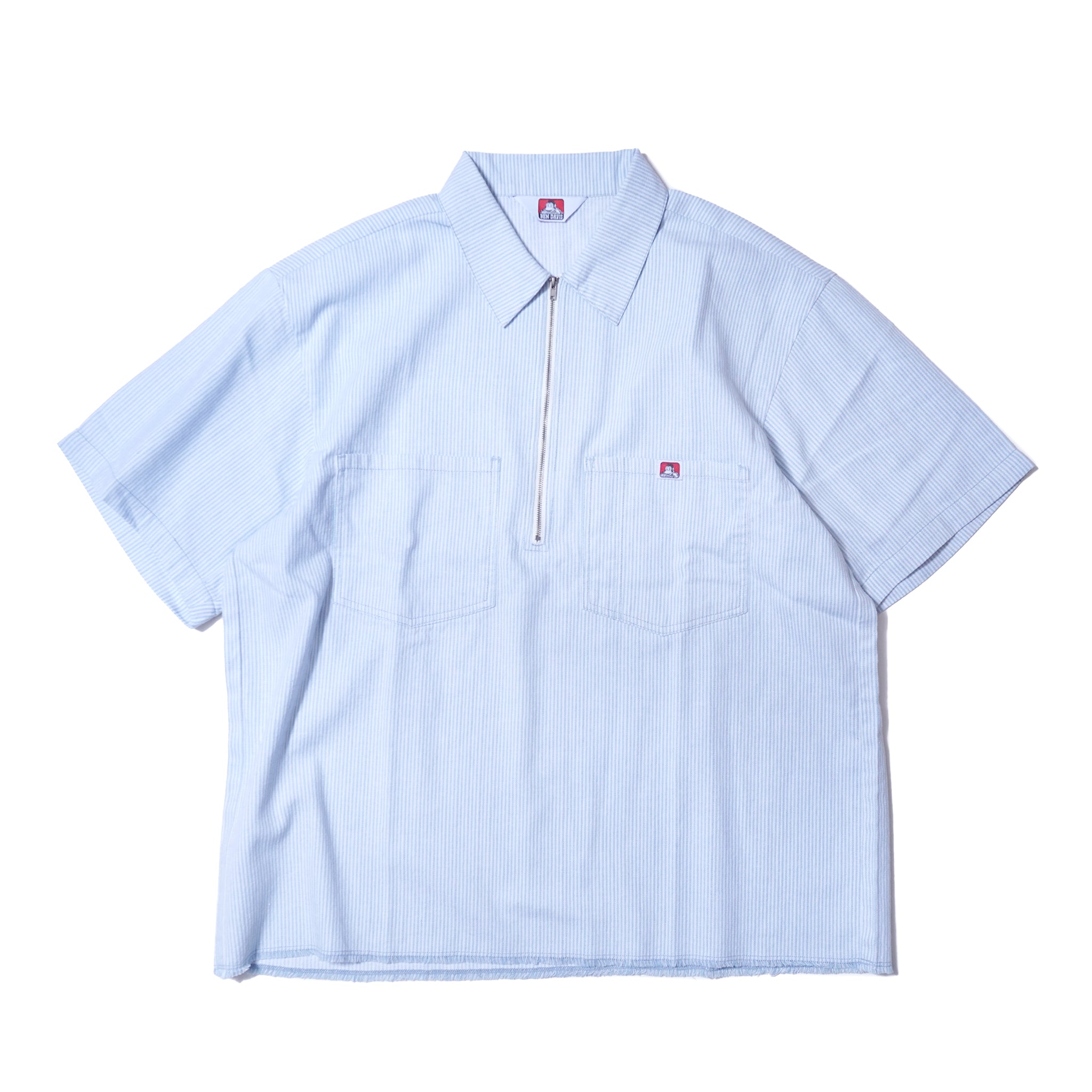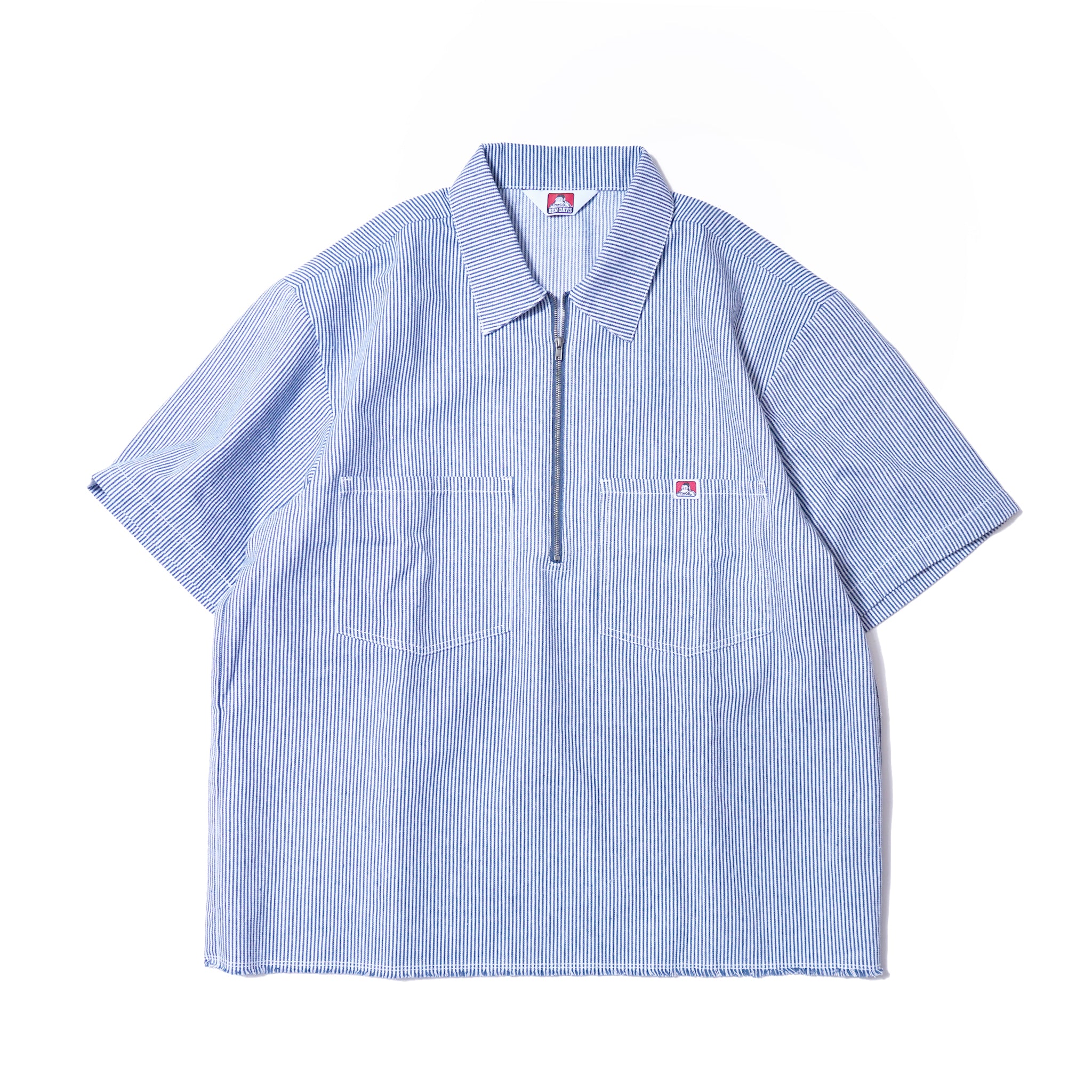 ワークウェアの王道、ヒッコリーストライプが印象的なハーフジップタイプの半袖シャツ。
