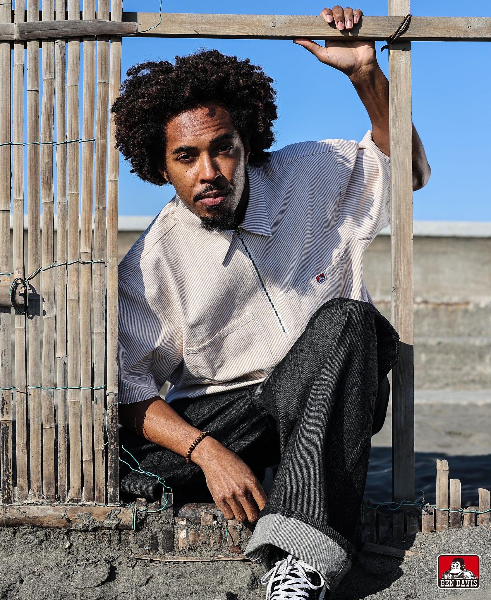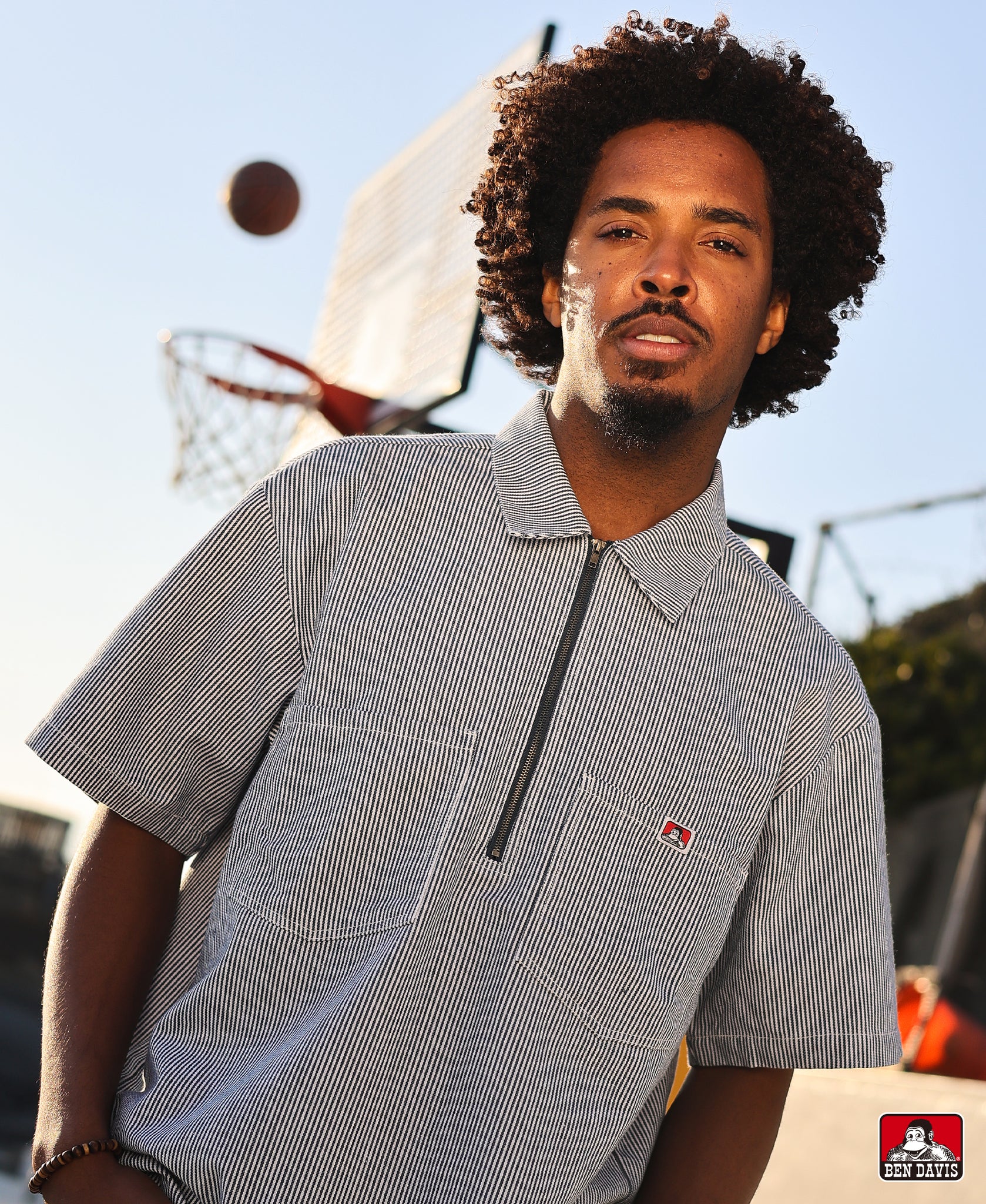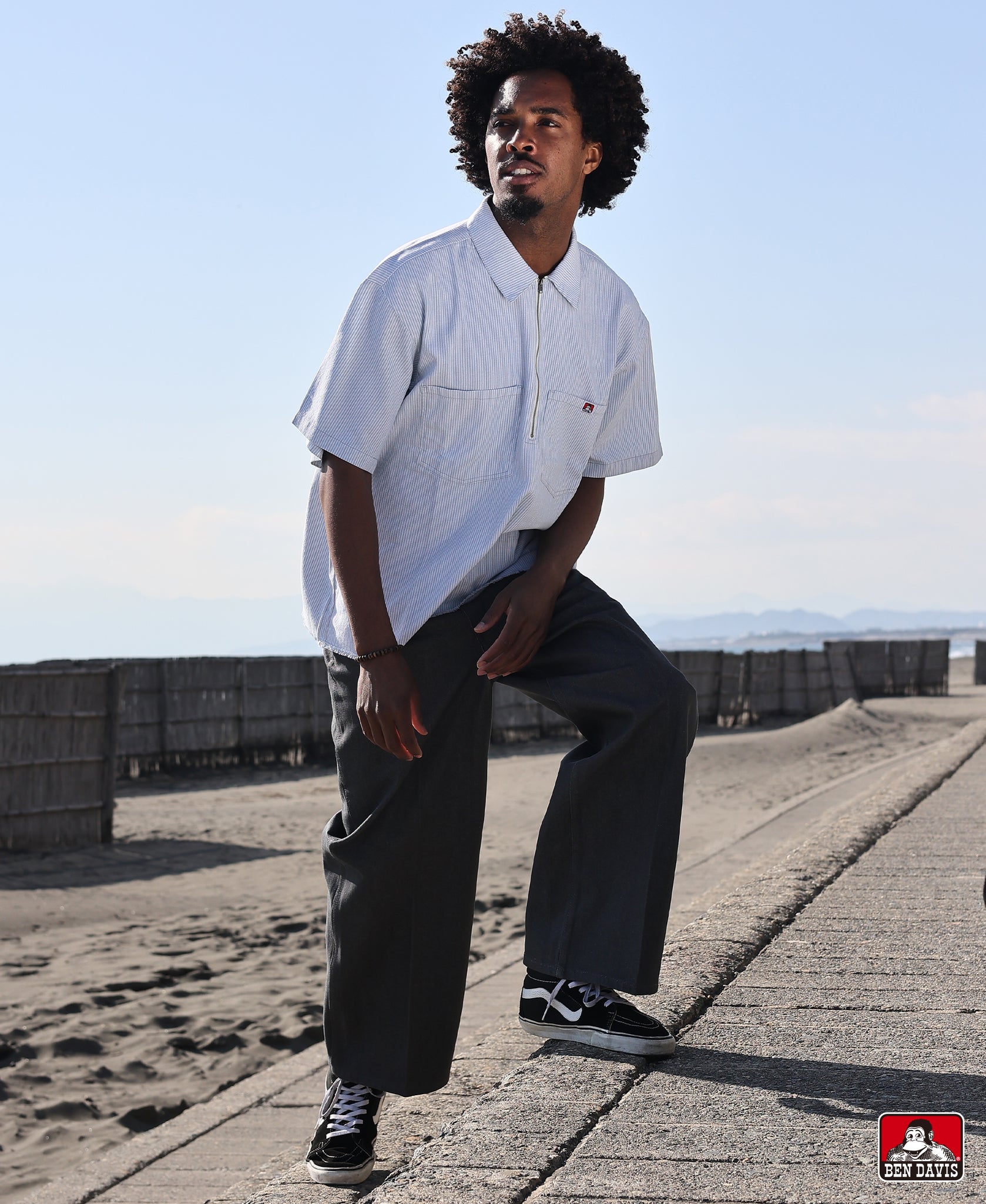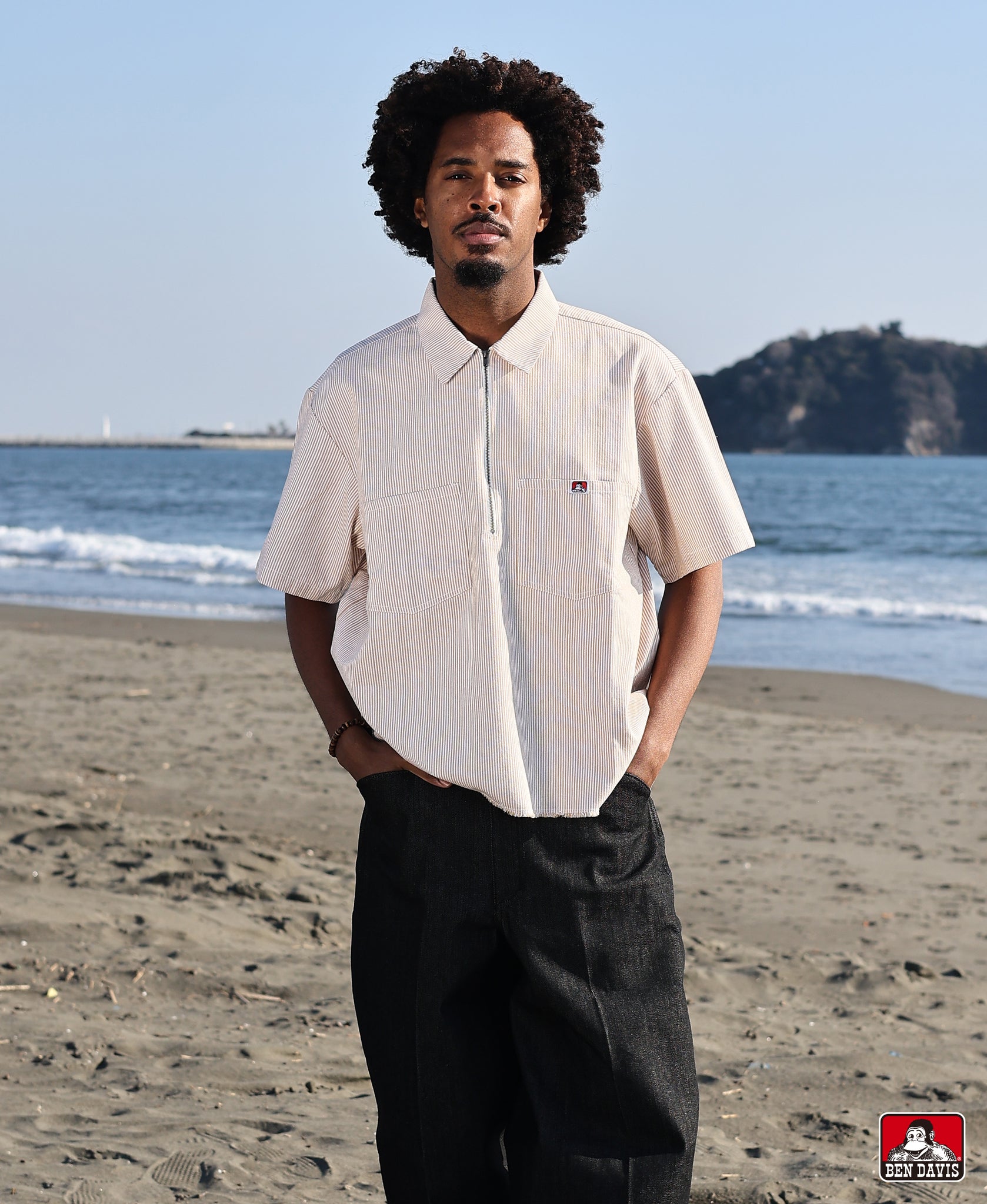 Ben Davis の象徴の一つとも言えるハーフジップ仕様がアクセントになり、シンプルながらストリート感のある仕上がりです。